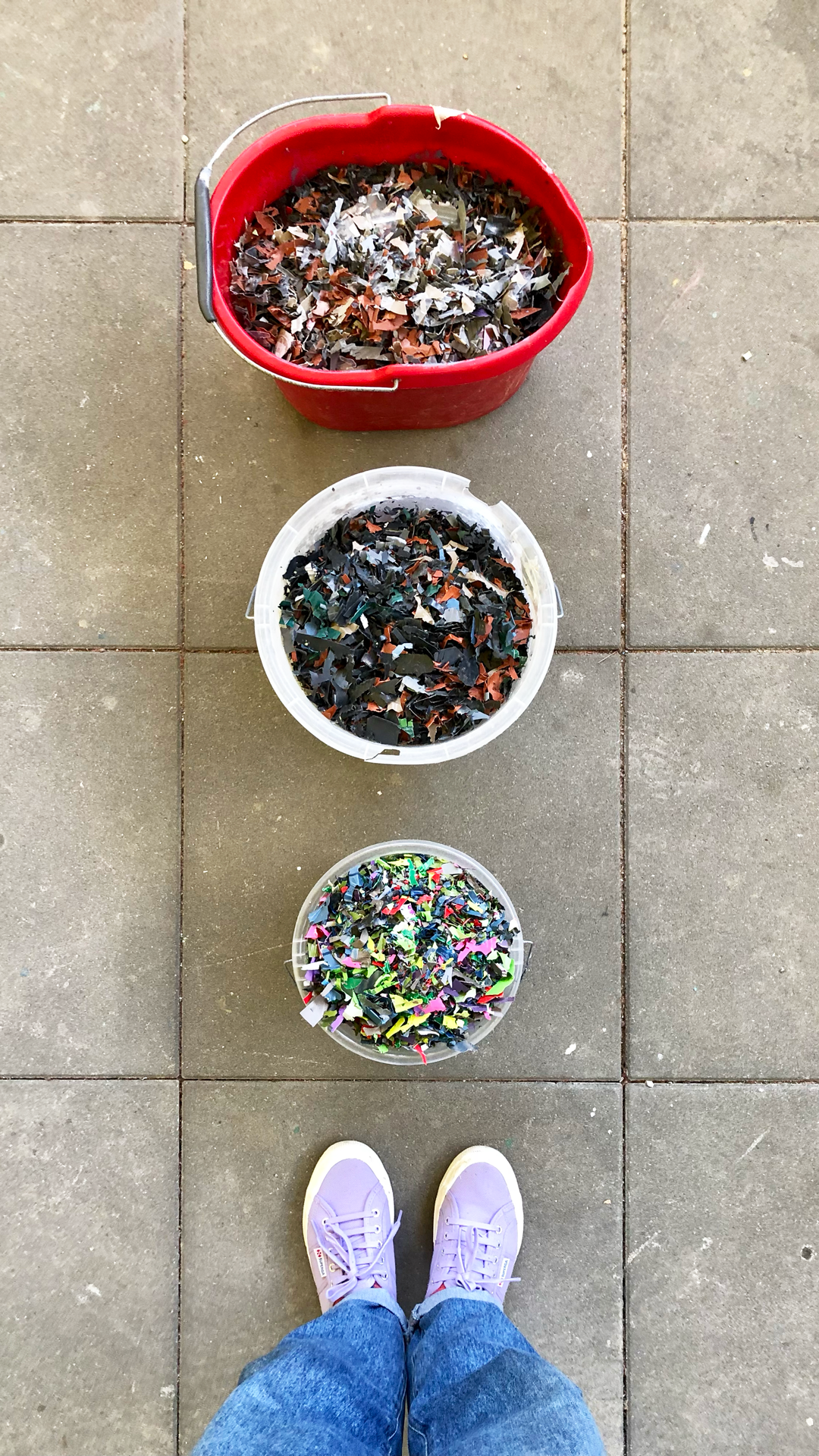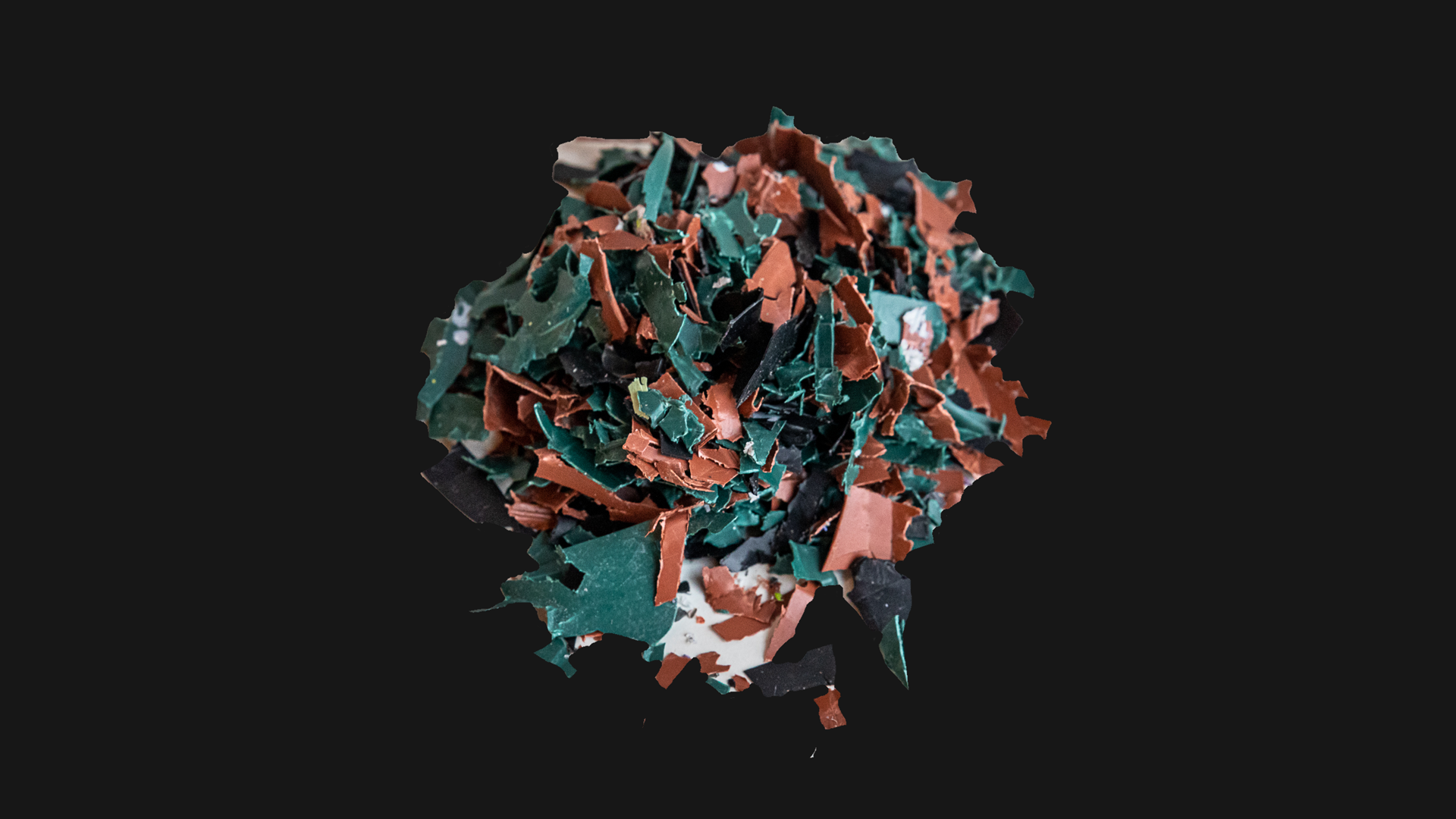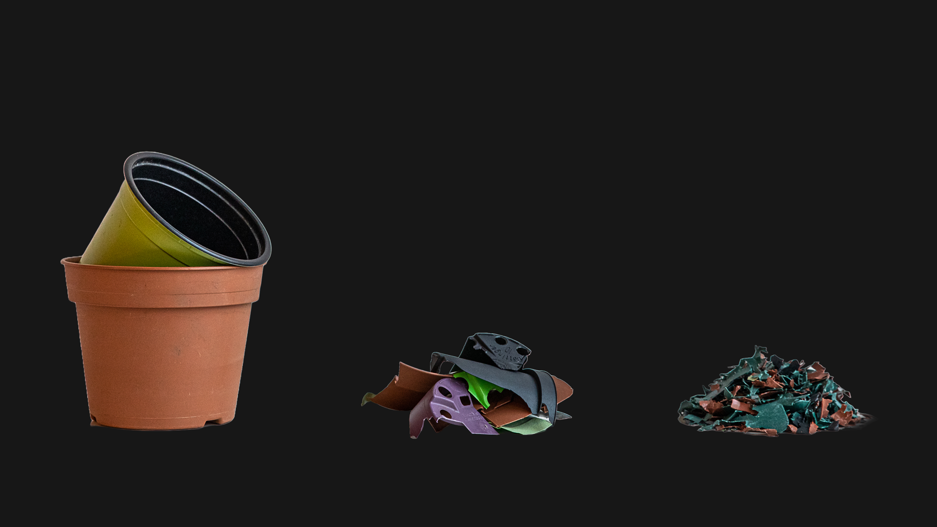 Plastic board entirely from 100% recycled plastic from discarded flower pots. Little fragments of shredded plastic compressed by heat into a durable versatile board.