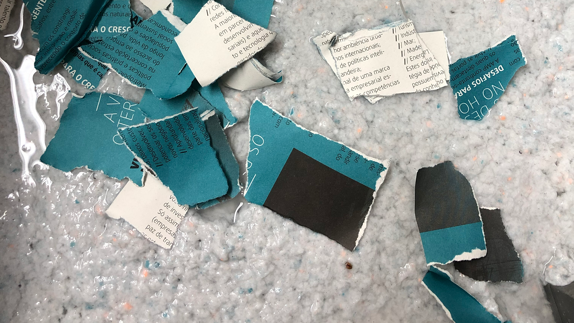 The recycled paper is combined with water in a large vessel that acts like a blender to separate fibres in the paper sheets from each other.